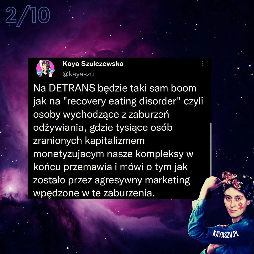 Na DETRANS (osoby, które zrezygnowały lub przerwały tranzycje) będzie taki sam boom jak był swego czasu na „recovery eating disorder” czyli osoby wychodzące z zaburzeń odżywiania, gdzie tysiące osób zranionych kapitalizmem monetyzujacym nasze kompleksy, w końcu znajduję siłę, by przemówić i opowiedzieć o tym jak zostało przez agresywny marketing wpędzone w te zaburzenia.