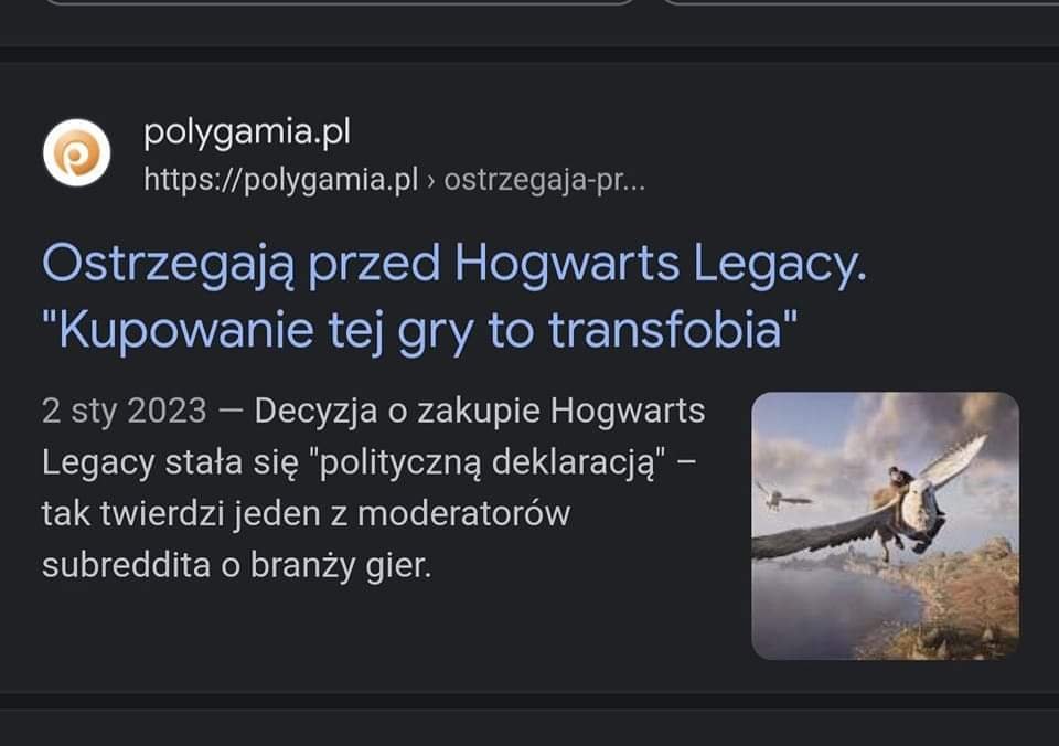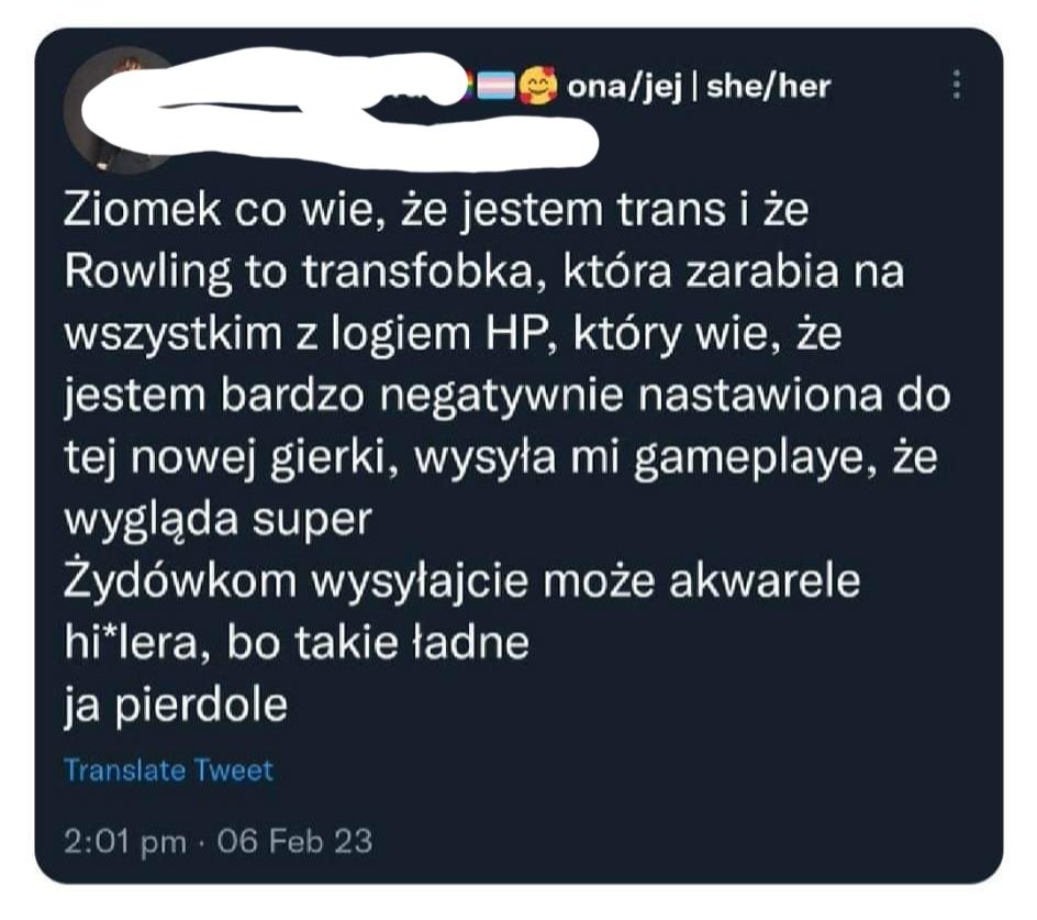 Jako, że wychodzi nowa gra inspirowana uniwersum Harrego Pottera – to świetny moment, żeby inkluzycja mogła się wykazać. Można ścigać już nie tylko urojonych we własnej głowie transfobów, ale też wszystkich, którzy w te grę grają, firmy, które grę reklamują itd.